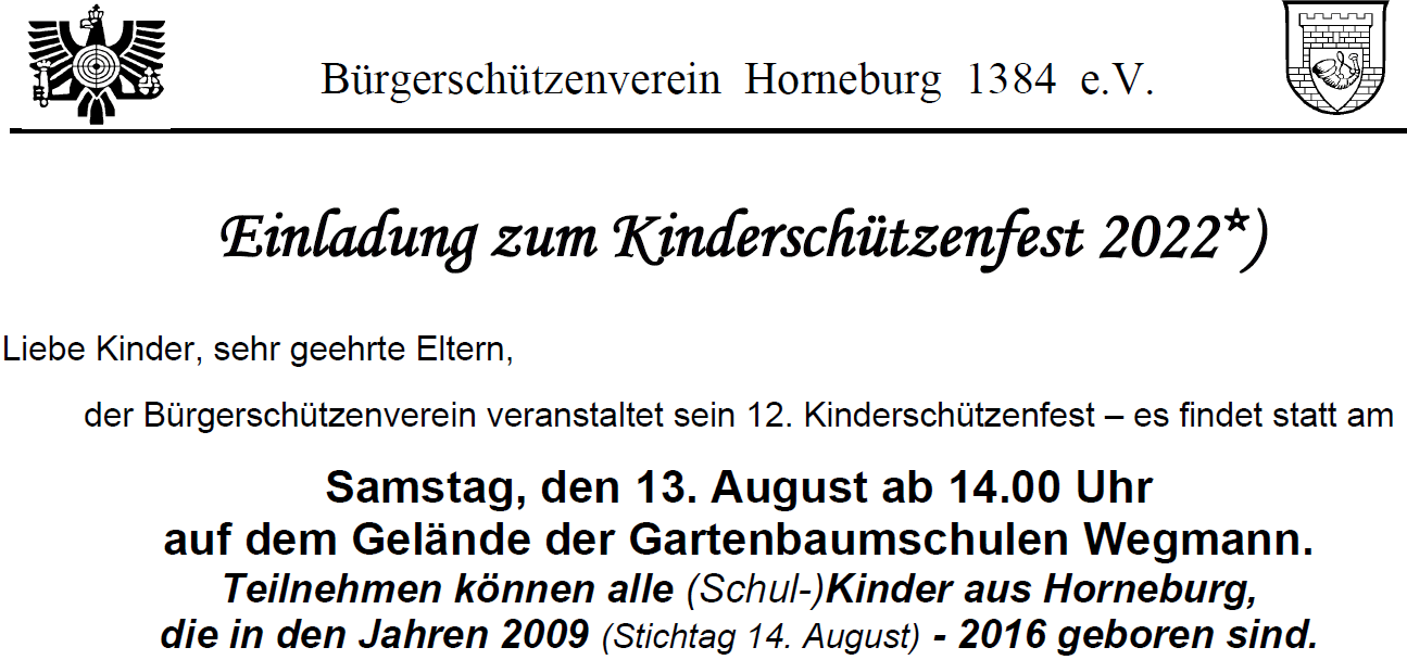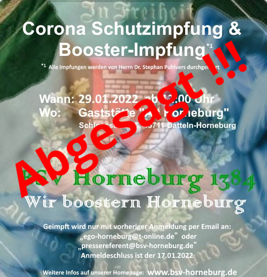 nachdem unser Schützenfest in Hornbeurg corona-bedingt zuerst von 2020 auf 2021 verschoben wurde, hat sich trotz der Vorfreude und Hoffnung auf ein großes Fest der Vorstand des Bürgerschützenvereins in der letzten Online-Vorstandssitzung nach reichlicher Abwägung schweren Herzens dazu entschlossen, das geplante Schützenfest vom 07. – 09. August 2021 vorbehaltlich der Abstimmung in der Generalverasammlung abzusagen und "turnusmäßig" im August 2023 wieder zu veranstalten.