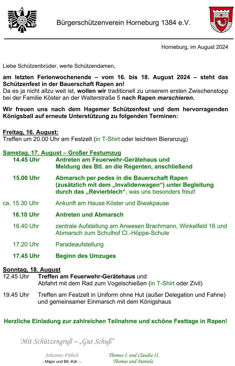 Nachdem beim Schützenfest 2023 leider der große Umzug wetterbedingt abgesagt werden musste, hoffen wir in diesem Jahr natürlich, dass wir mit herlichestem Sonnenschein an den Schützenfesttagen belohnt werden.